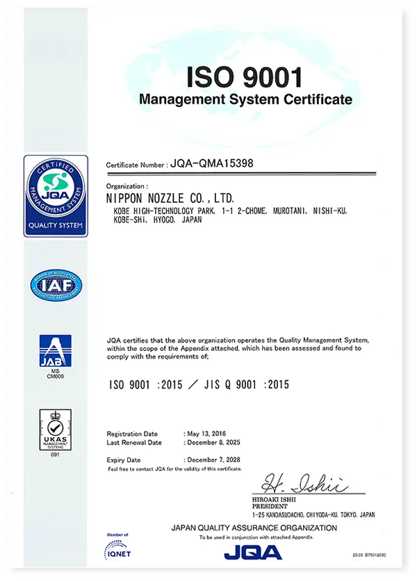 日本喷丝板为了提供持续的高品质产品,构筑了必须的管理守则,对于产品的精度,及技术的提高,取得了品质管理体系的国际认证ISO9001体系